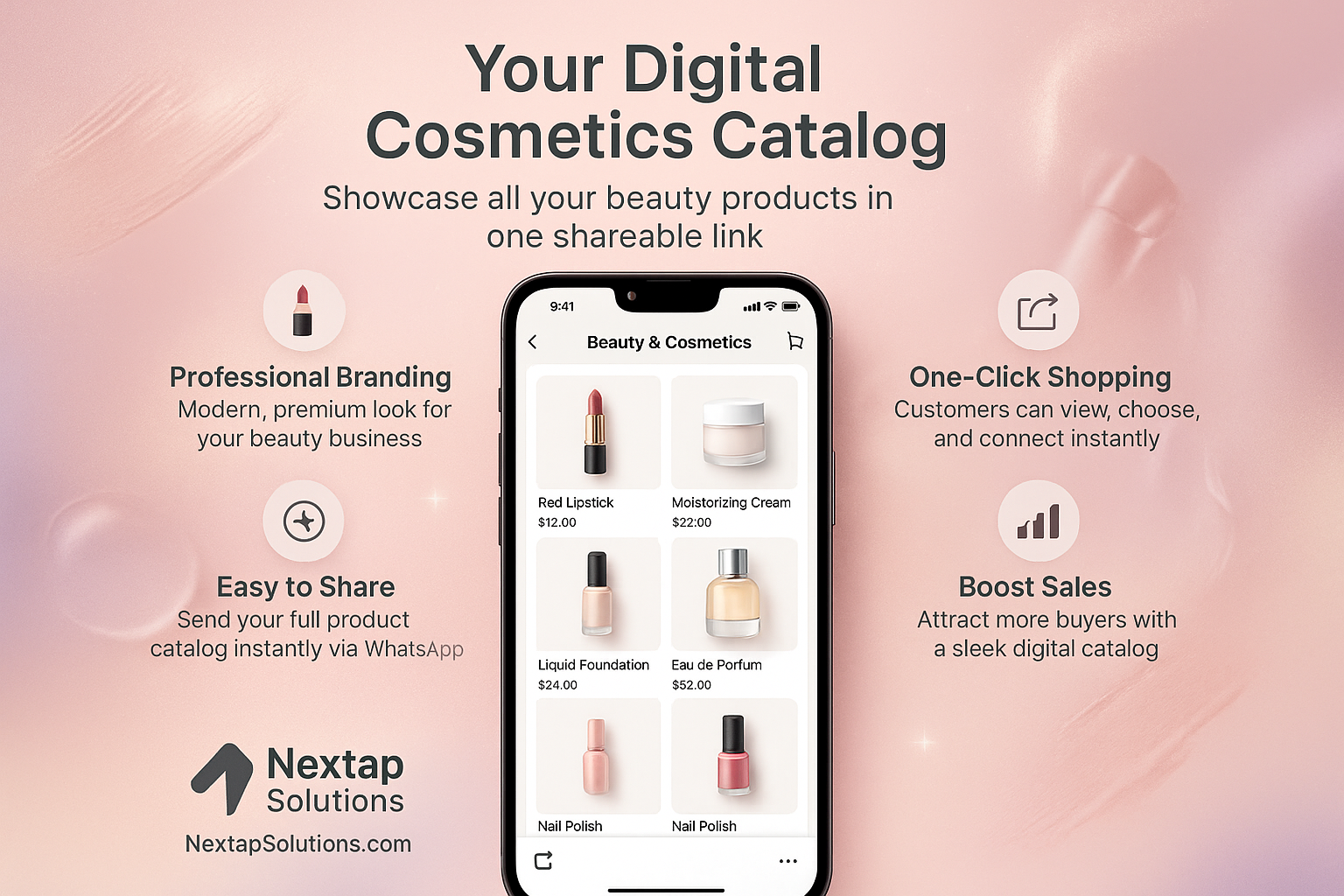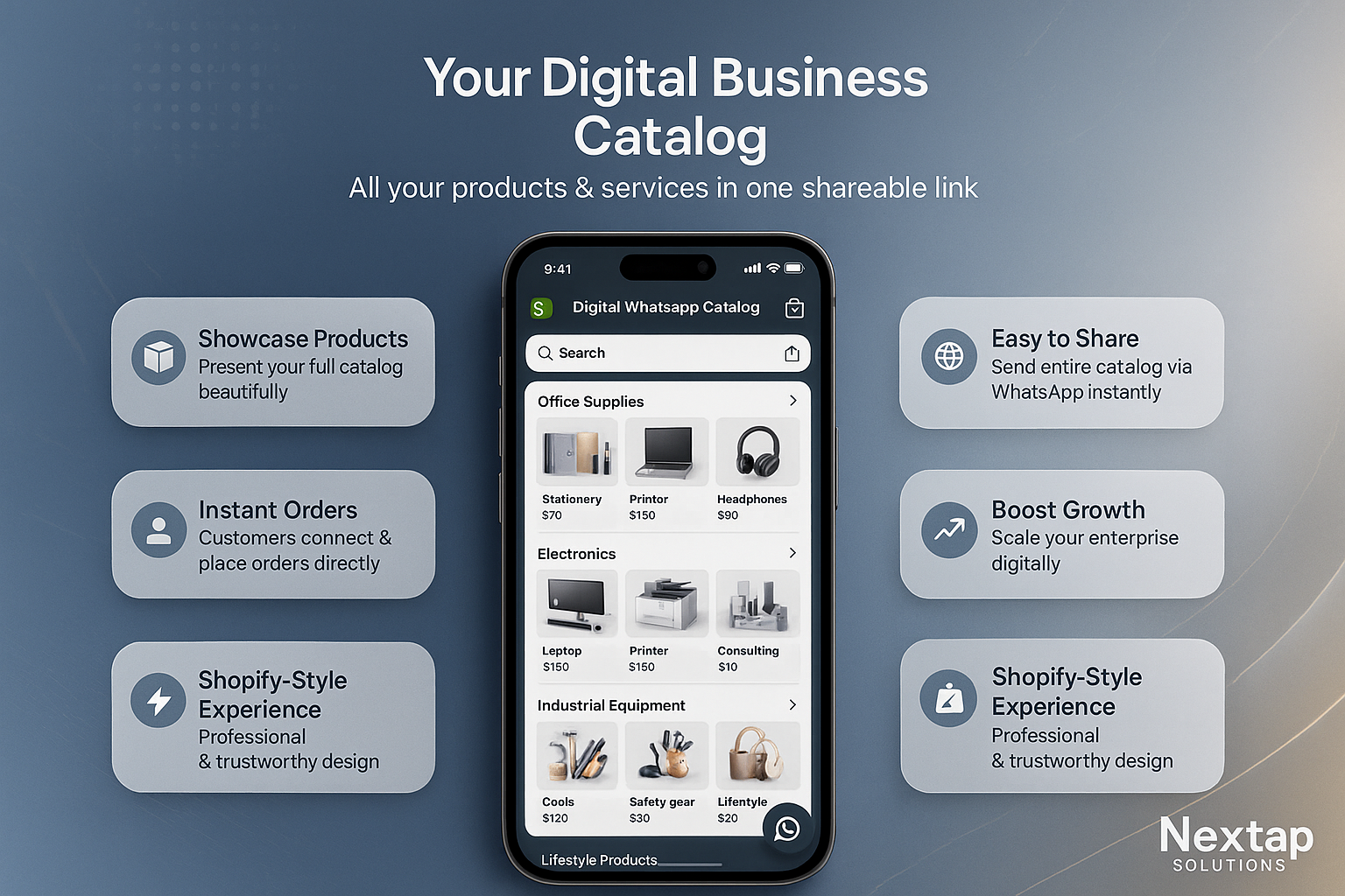 With Nextap Solutions Digital WhatsApp Store + Catalog, your customers can browse, select, and order products instantly β all inside WhatsApp. No complex apps, no waiting. Just one click, and youβre ready to sell!